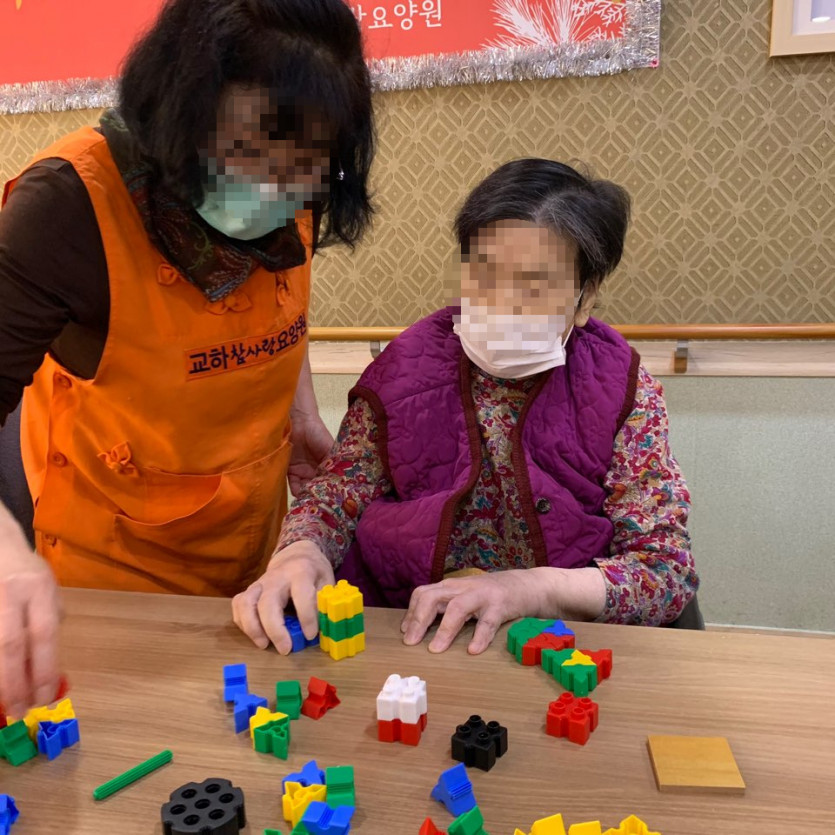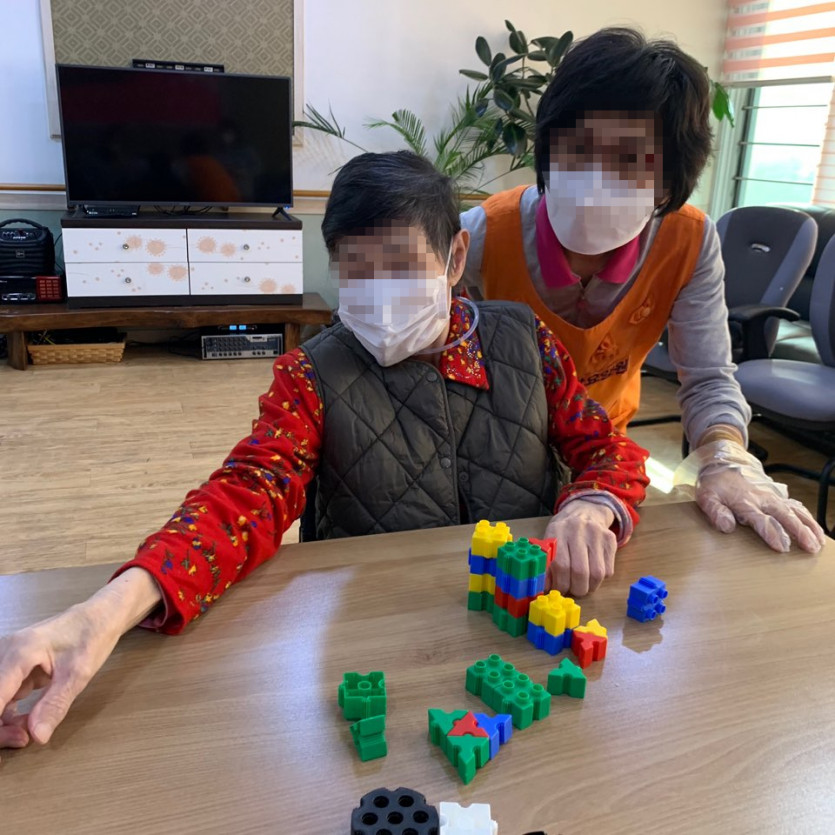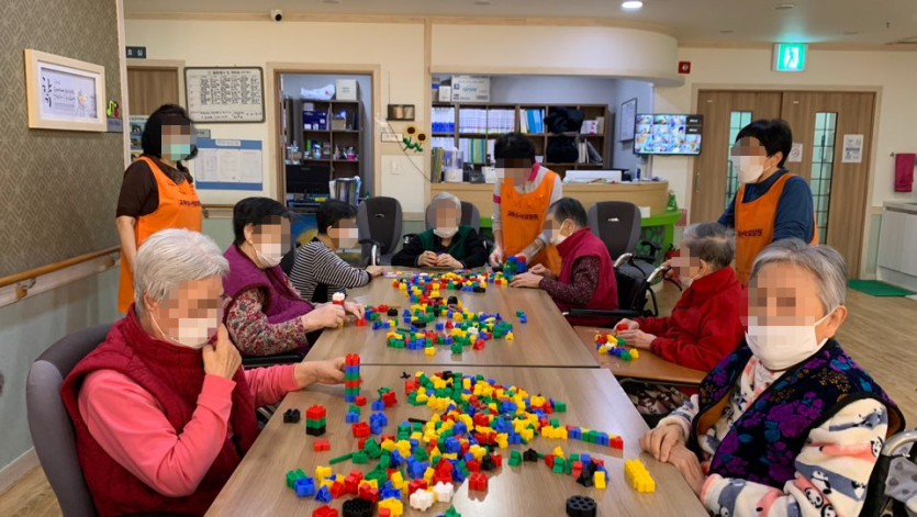 오늘은 우리 어르신들과 선생님들 모두 함께 즐거운 블록놀이 시간을 가졌습니다.